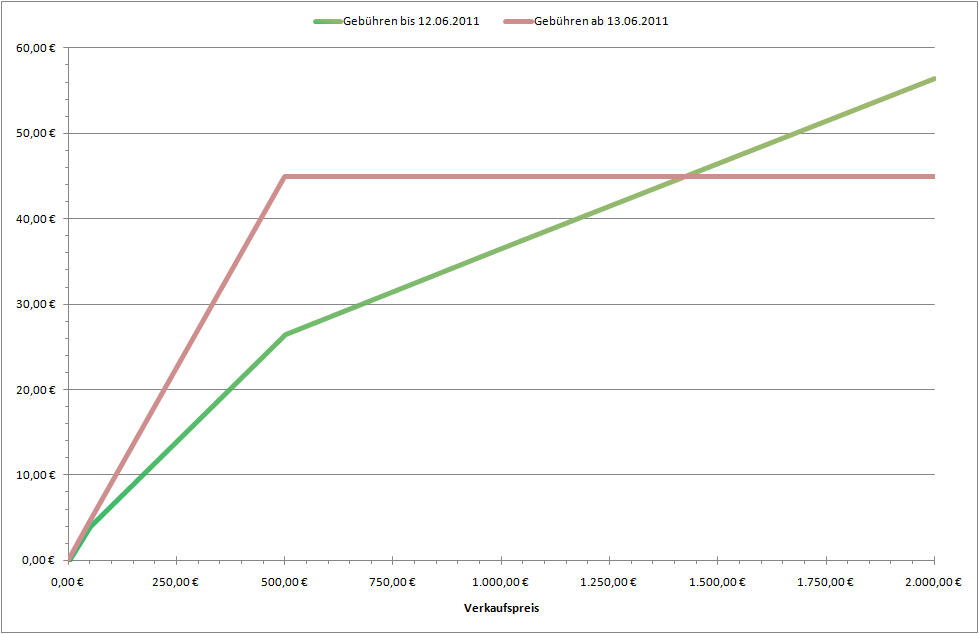 Wer gerade genüsslich seinen Kaffee schlürft, sollte selbigen jetzt lieber abstellen! Allein wer einen Blick auf die 500 Euro wirft fällt schon fast mit Herzinfarkt vom Hocker. Anstatt 26,50 Euro möchte eBay für die gleiche Leistung ab Mitte Juni ganze 45 Euro haben - immerhin stolze 69,81 Prozent mehr als bisher. Da ich Zahlen selber zu abstrakt finde, hier einmal das neue Gebührenmodell von 0 bis 2.000 Euro Verkaufssumme im Vergleich.