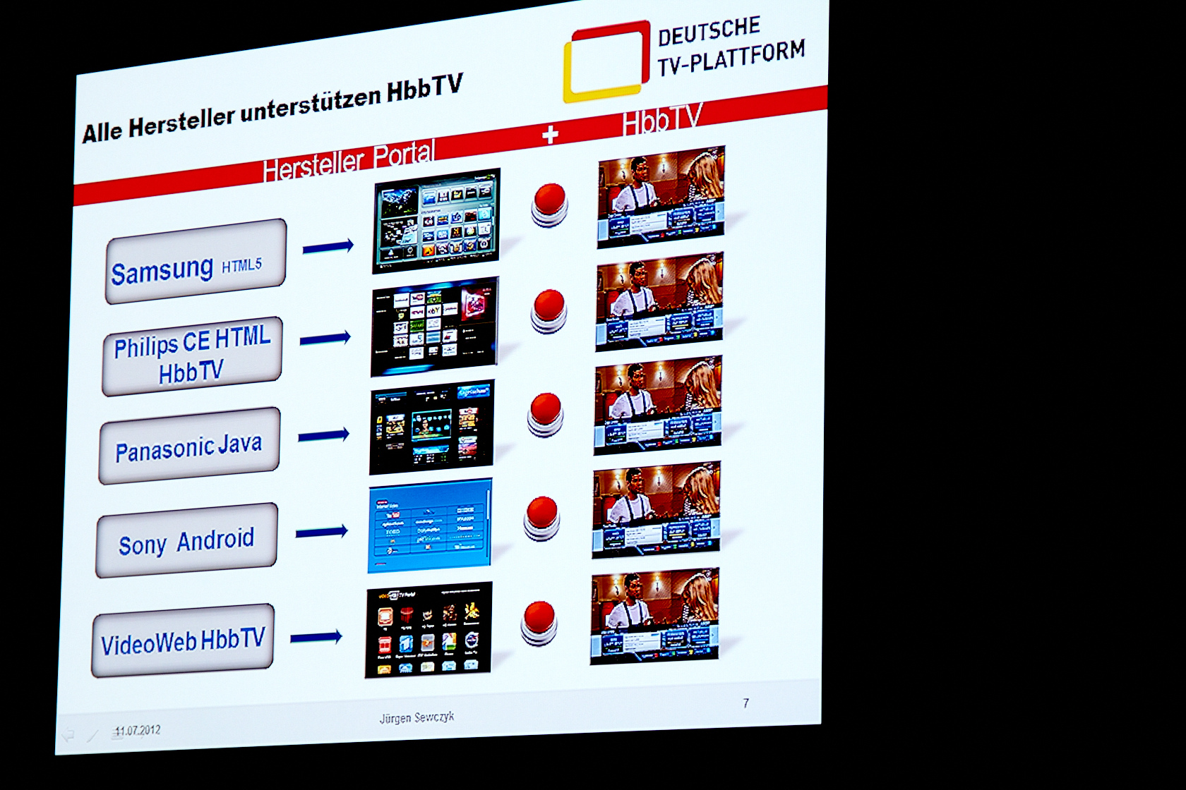 Würden die Fernsehsender die Oberhand behalten wollen, stünden sie jedoch direkt vor einem Problem: Wie lässt sich dies realisieren? Ist der neue Dienst für Zusatzinformationen und quasi Nachfolger vom Videotext HbbTV (Red Button-Funktion) gut normiert und wird in Deutschland bereits breit unterstützt, sieht es bei den von den Fernsehherstellern integrierten Portalen wesentlich schlechter aus. Von an HbbTV angelehnten Lösungen (Philips, Toshiba), über Java (Panasonic), einem Ableger des Google Betriebssystems Android (Sony) und modernem HTML5 (Samsung) ist so ziemlich alles vertreten.