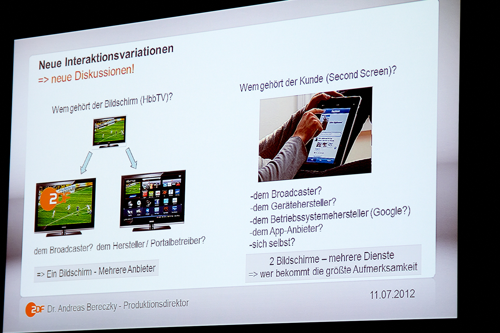 Eine Frage die Dr. Andreas Bereczky (Produktionsdirektor des ZDF) erst als vorletzter Redner in dem Raum brachte. In Anlehnung an die Wikipedia-Definition von Smartphones schlägt er, für einen Wikipedia Eintrag über SmartTVs, den einleitenden Satz vor: