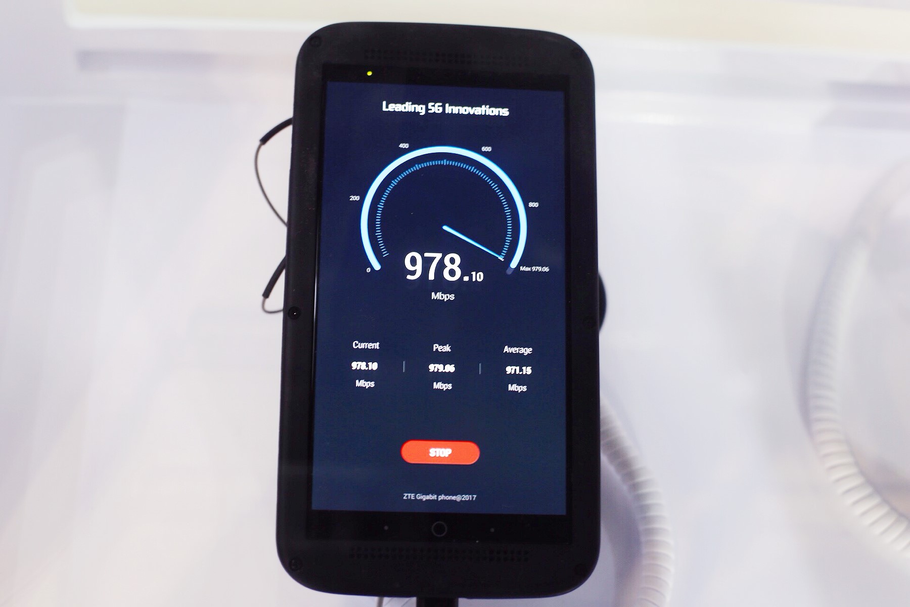 Ebenfalls auf dem Mobile World Congress auf dem ZTE-Stand in Barcelona zu sehen ist das ZTE Gigabit Smartphone. Die von ZTE entwickelte Studie ermöglichte bei Tests Datenübertragungsraten von bis zu einem Gigabit pro Sekunde (GBit/s) auf dem Smartphone.