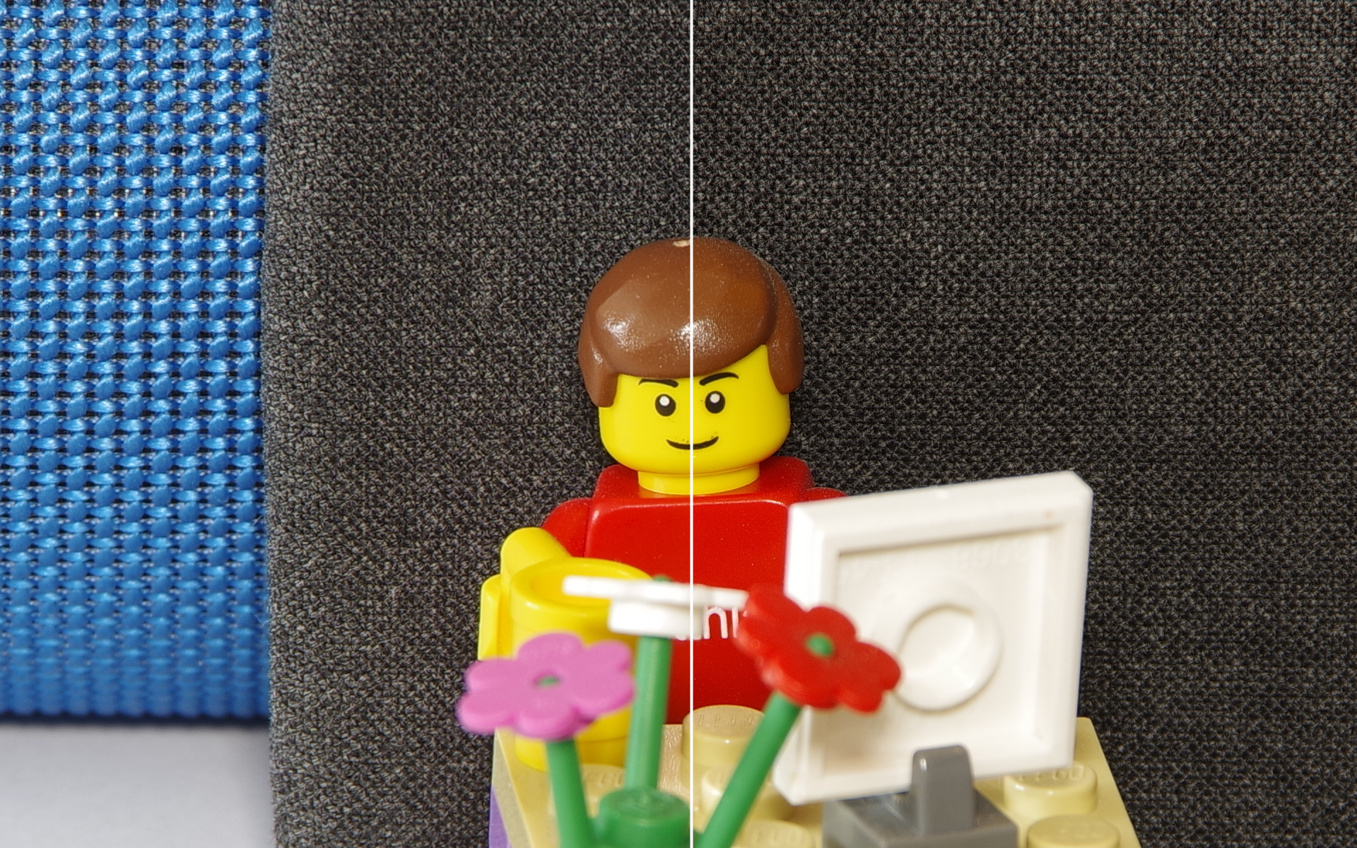 Vor allem an feinen Strukturen (hier z.B. die Stofftextur hinter der Lego-Figur) lässt sich eine erhöhte Bildschärfe und Plastizität feststellen. Aufgrund der hohen Anforderungen an die Stabilität der Kamera sowie des Objektes vor der Kamera eignet sich auch Pixel Shift Resolution nur für die Aufnahme stillstehender Motive zusammen mit einem Stativ. Aus der Hand lässt sich genauso wenig fotografieren wie bewegte Objekte vor der Kamera.