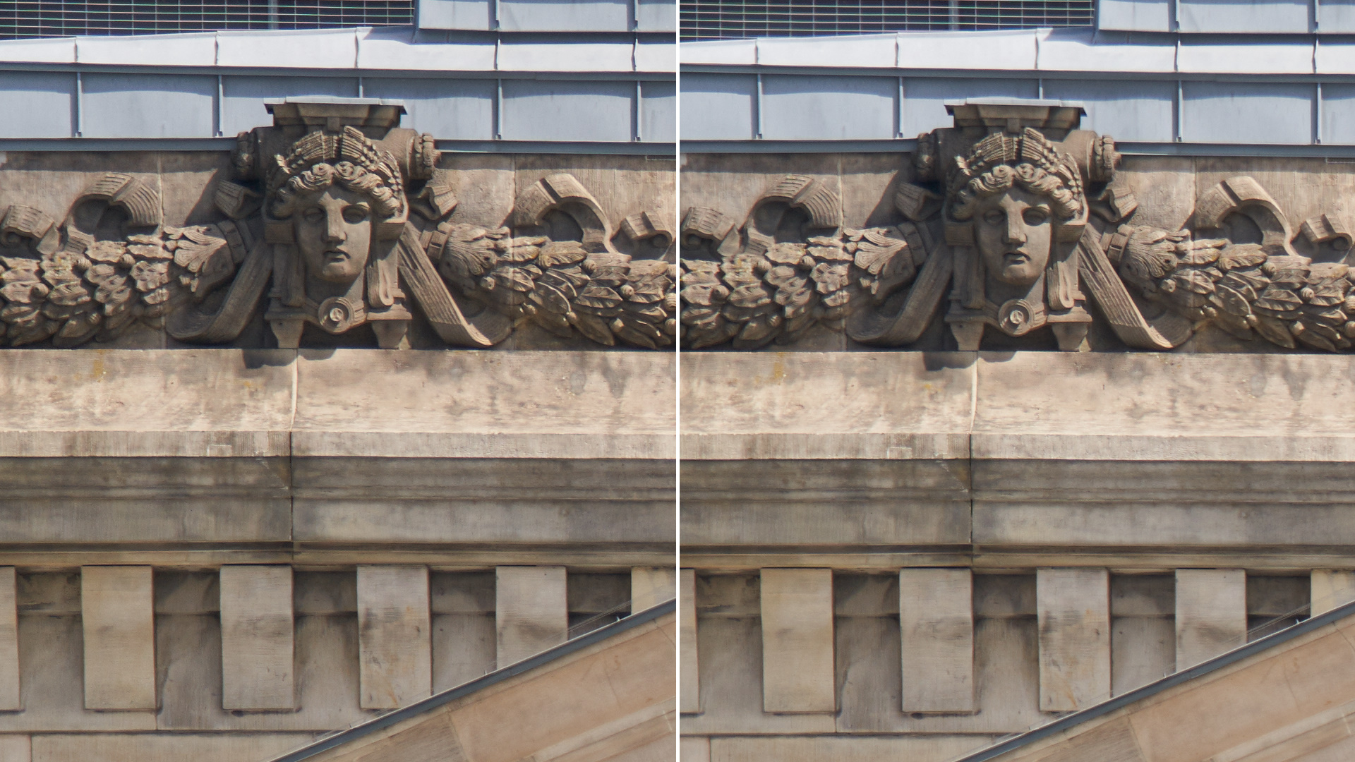 Bei 150 mm ist die Bildschärfe am äußersten Bildrand (siehe Bild oberhalb) schon bei Offenblende auf hohem Niveau und gewinnt nicht mehr sichtbar beim Abblenden. Ein ähnliches Bild ergibt sich bei 300 und 600 mm Brennweite (siehe Bild unterhalb). Einzig und allein die chromatische Aberration ist, ohne Software-Korrekturen, noch zu erkennen.