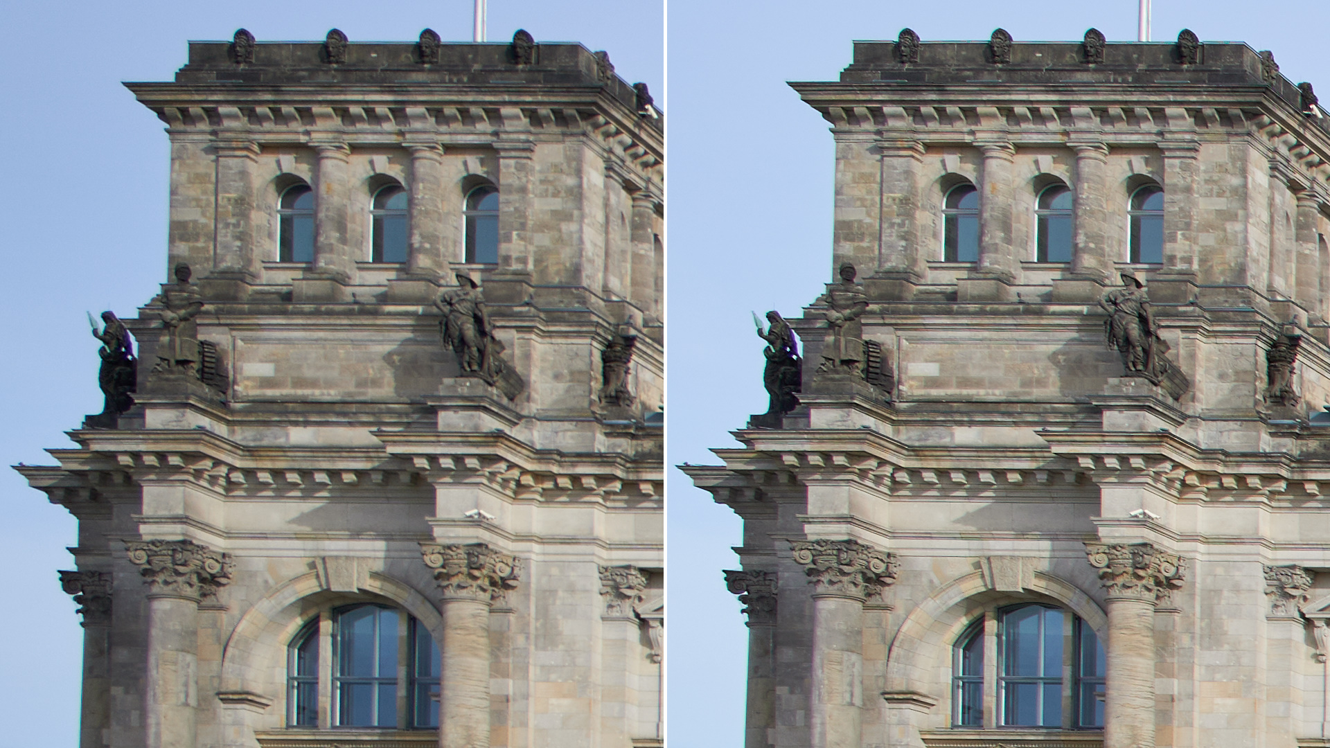 Die Vignettierung (Randabschattung) ist bei allen Brennweiten erfreulich oder eher überraschend gering, hat man die kompakten Abmessungen im Hinterkopf. Letzte Reste lassen sich dank des integrierten Profils einfach entfernen. Nicht ganz so gut steht es um die Verzeichnung: Wer Architekturaufnahmen bei 18 mm anfertigen will, kommt um die Software-Korrektur definitiv nicht herum.