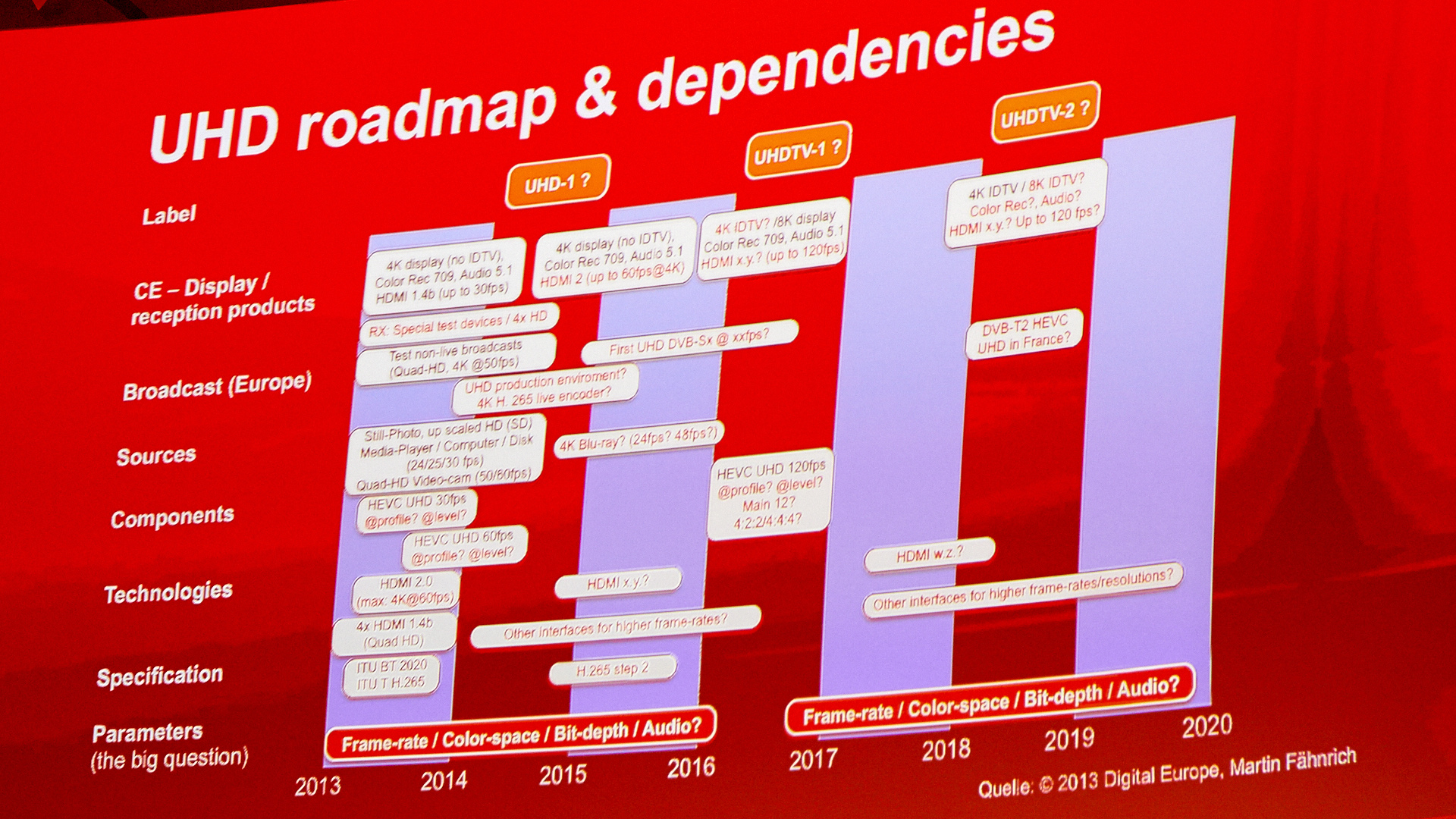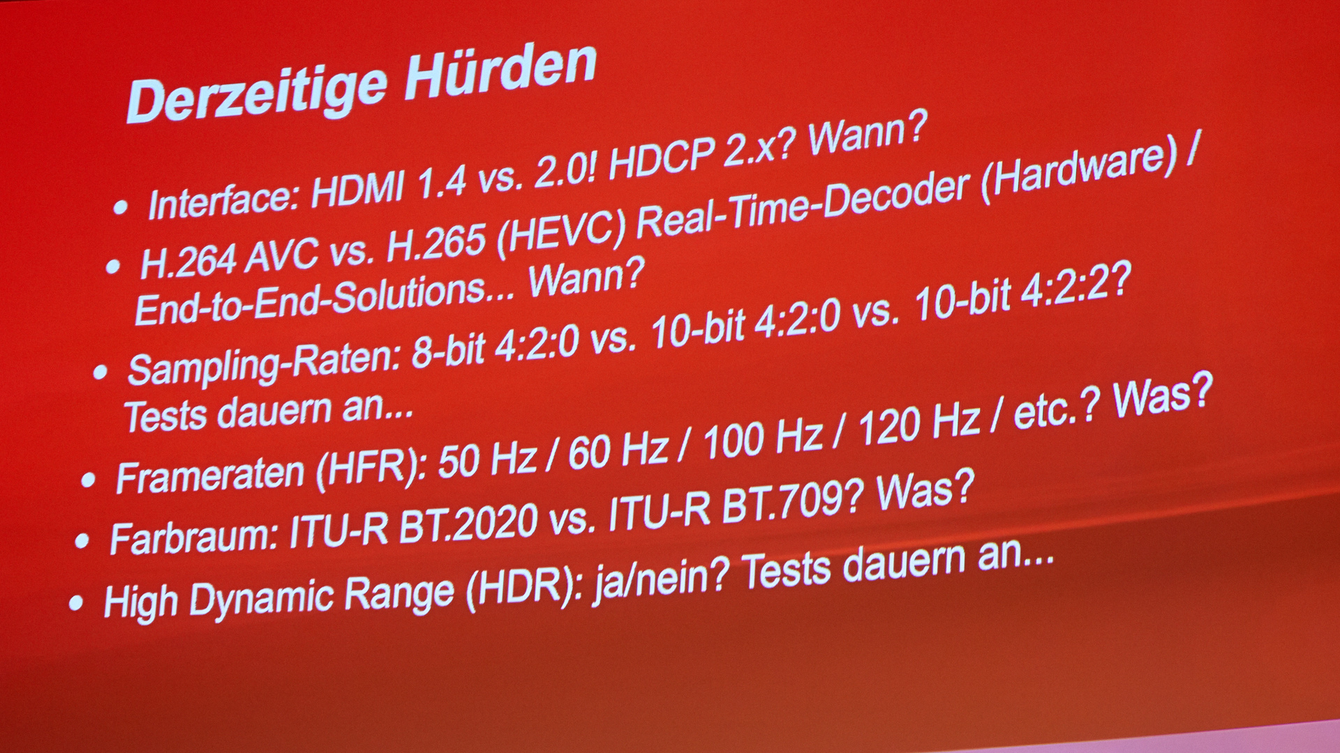 Auch die rein physikalische Übertragung vom PC, Notebook, Tablet oder eben dem Blu-Ray-Player sorgt derzeit noch für Probleme. Zwar kann HDMI in der aktuellen Version (1.4b) UHDTV mit bis zu 30 Bildern pro Sekunde übertragen. Jedoch sind für UHDTV neben einer höheren Auflösung auch eine größere Farbtiefe (10 bit), weitere Farbräume sowie eine höhere Farbauflösung (4:2:2 oder 4:4:4 anstatt 4:2:0) im Gespräch - genauso wie 60 oder später bis zu 120 Bilder je Sekunde. Man erkennt an der, in dieser Hinsicht "anschaulich verwirrenden", Folie die aktuellen Baustellen bei der Standardisierung. Noch ist weder das Kompressionsverfahren (HEVC), die Übertragungstechnik (DVB-T/S/C), die Speicherung (Blu-Ray), der Kopierschutz (HDCP 2) oder die zu unterstützende Bildrate festgelegt. Dementsprechend gibt es auch noch kein UHDTV-Logo wie man es von HD-Ready oder Full-HD gewöhnt war. Die Käufer von den ersten UHDTVs laufen also Gefahr am Ende womöglich auf einem nicht vollends kompatiblen Endgerät sitzen zu bleiben.