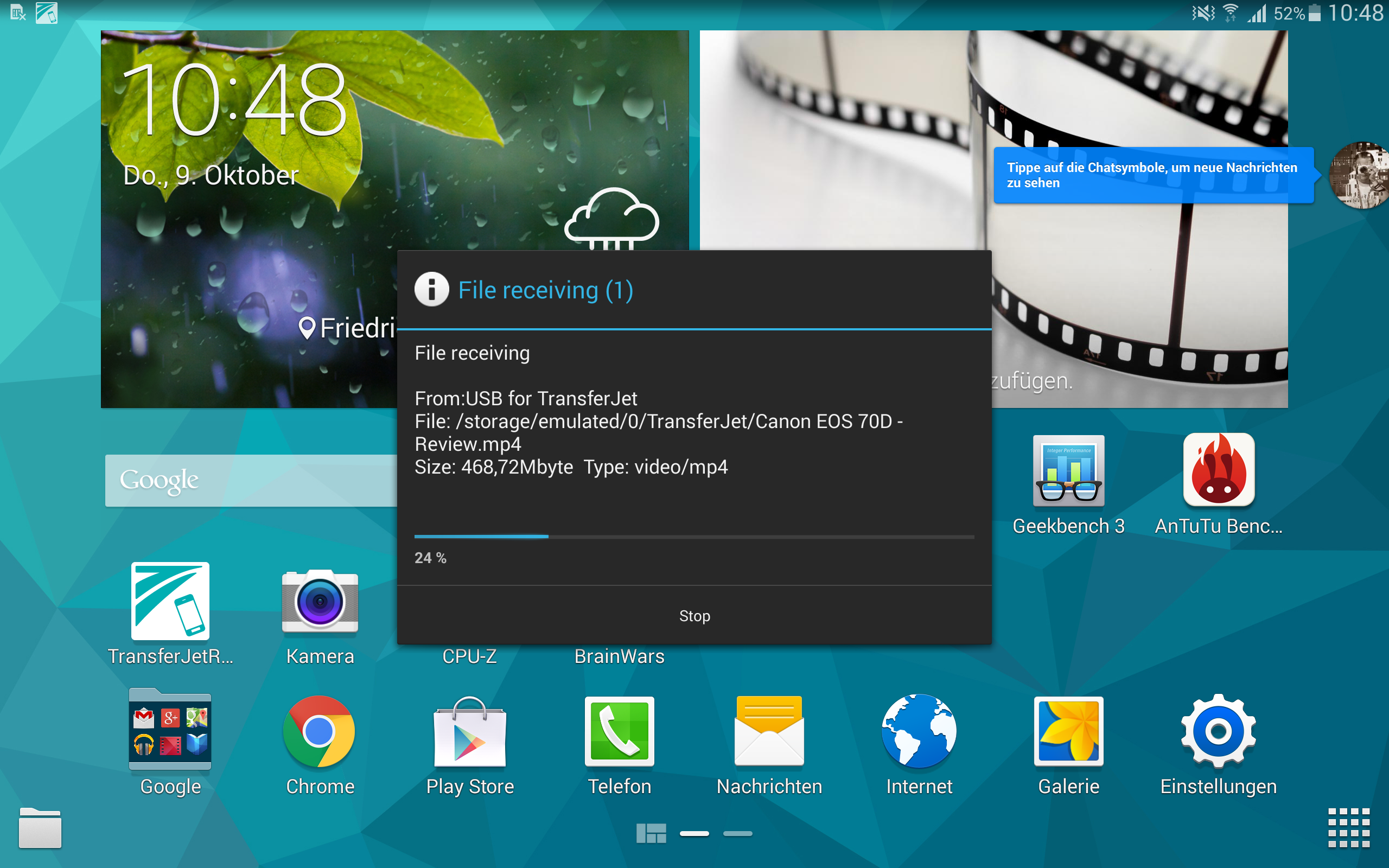 Mit unseren beiden Testmustern konnten wir "nur" Datenraten von 12,5 MB/s (100 Mbit/s) erreichen, was aber trotzdem ausreicht, um einen kurzen HD-Film oder mehrere Bilder vom Smartphone in wenigen Sekunden zu übertragen. Auch hier bleibt die Hoffnung auf bessere Ergebnisse, sobald die Technologie zum festen Umfang eines Smartphones gehört. Schon jetzt ist TransferJet deutlich schneller als Bluetooth, allerdings weniger komfortabel, da man für die Zeit der Übertragung die Geräte quasi direkt aneinander halten muss.