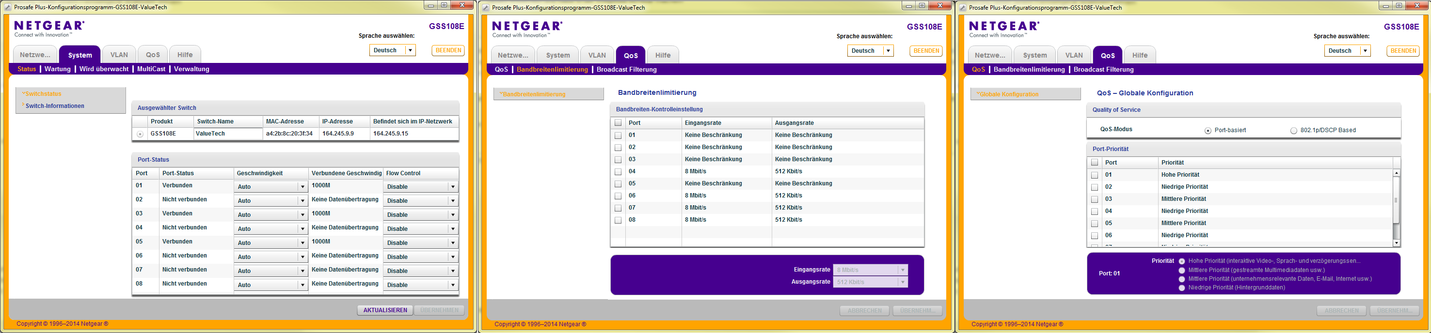 Über das ProSafe Plus Utility lässt sich der GSS108E bequem unter Windows konfigurieren. Die Möglichkeiten sind dabei durchaus umfangreich: QoS (Quality of Service) auf Basis von 802.1p oder den einzelnen Ports, Einschränkung der Geschwindigkeit (10, 100 oder 1.000 Mbit/s) sowie des Up- und Downlinks (512 Kbit/s - 512 Mbit/s) für jeden einzelnen Port, VLAN auf Port-Basis sowie nach 802.1Q, Multicast-Unterstützung sowie umfangreiche Wartungsfunktionen (Kabelüberprüfung, Firmware-Updates, Ex- und Import der Einstellungen) und Statistiken warten auf den Anwender.