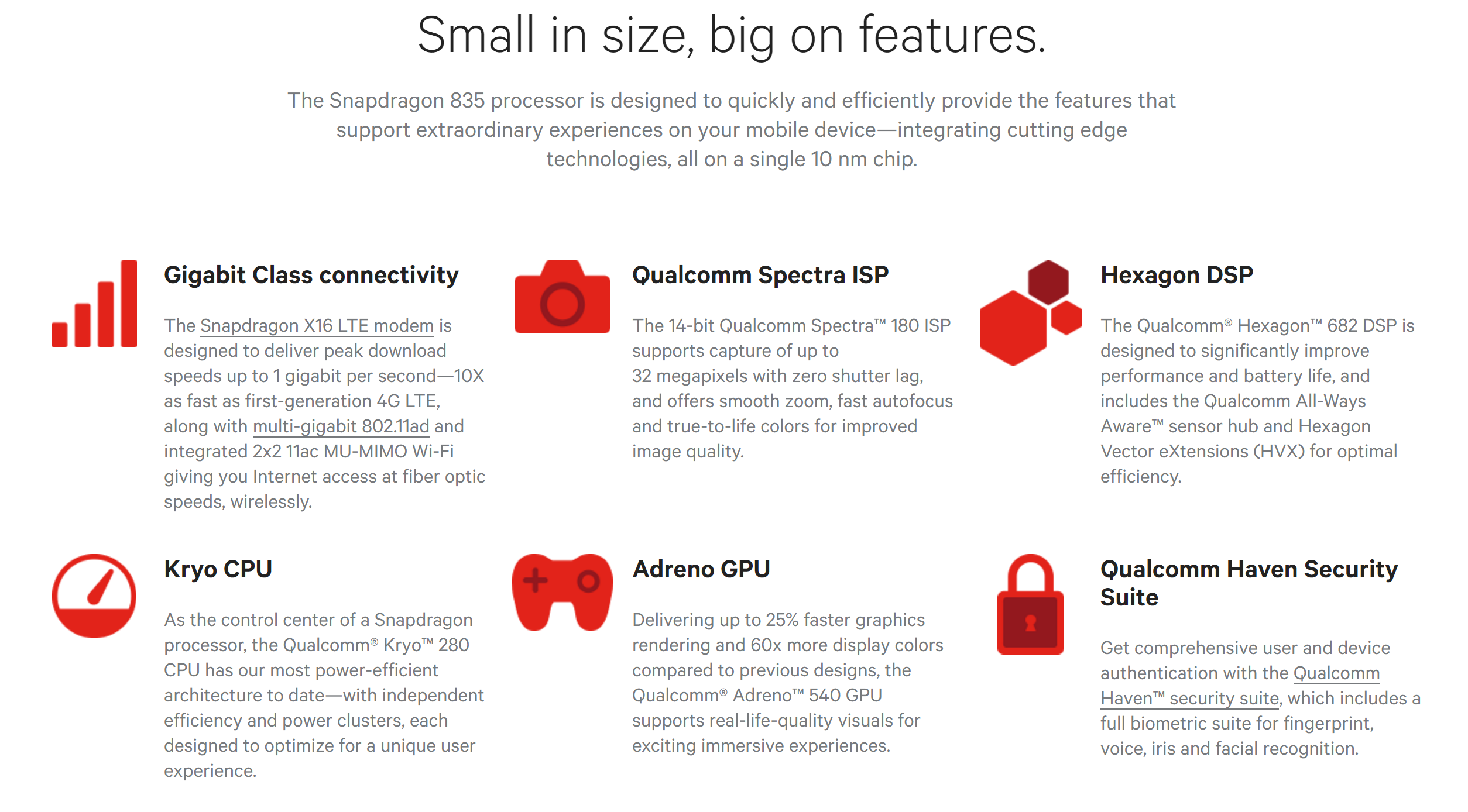 Der Snapdragon 835 stellt das neue Flaggschiff von Qualcomm dar und bietet so ziemlich alles, was sich Smartphone-Nutzer im Jahr 2017 nur wünschen können: 8 CPU-Kerne (Kyro 280, 64 bit) mit bis zu 2,45 GHz Taktfrequenz, die Adreno 540 GPU mit Unterstützung für zwei 4K-Displays und alle modernen Videoformate, das X16 getaufte Modem mit LTE Cat. 16 (1 Gbit/s Download), Gigabit-Wifi nach 802.11ad (60 GHz), Bluetooth 5.0, USB 3.1 und gleich fünf Navigationssystemen (darunter auch das europäische Galileo).