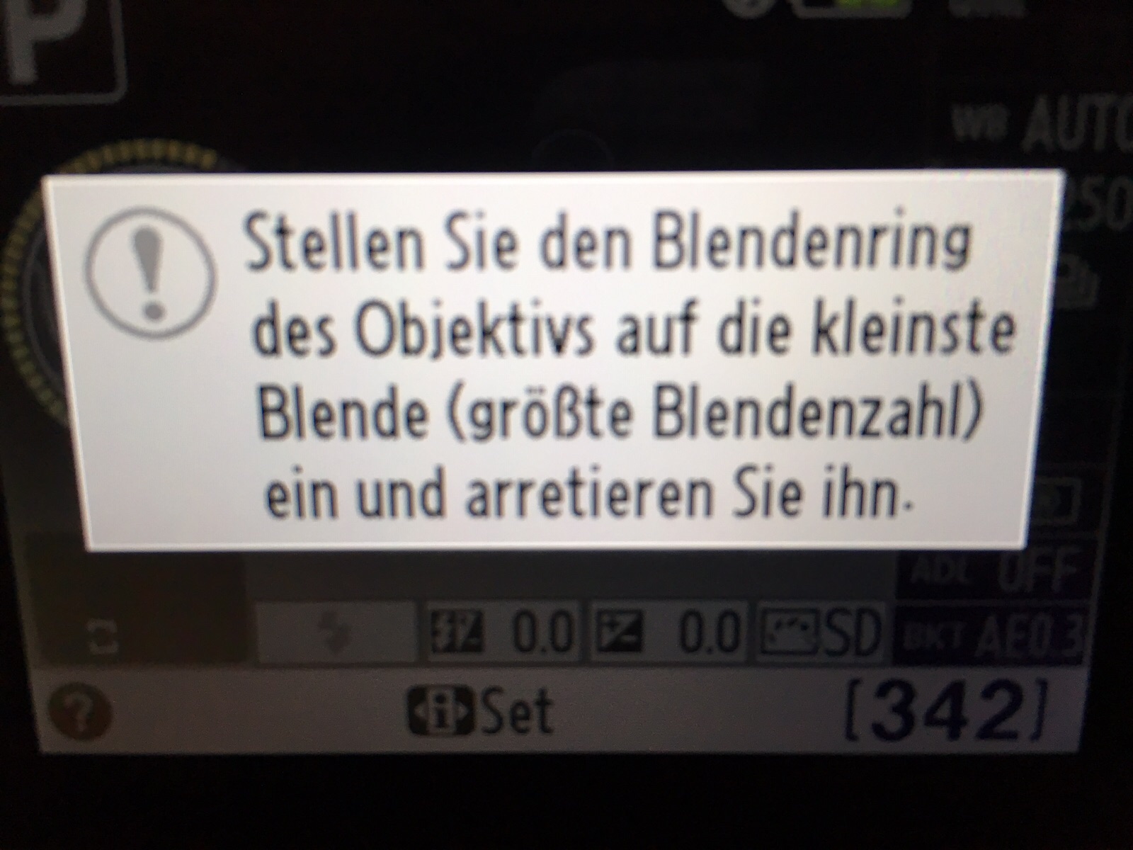 Wenn ich es befolge funktioniert es und ich kann Bilder machen. Will ich die Blende verändern rauscht aber sofort wieder die Meldung rein und ich kann keine Bilder mehr machen.