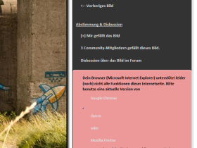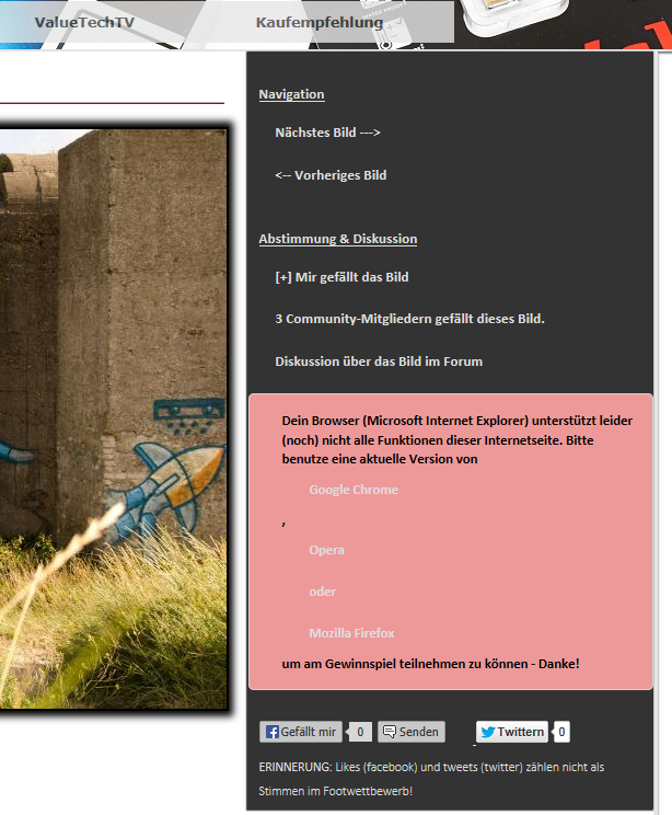 ich habe leider ein Problem am Gewinnspiel teilzunehmen. Möchte ich ein Bild bewerten, erhalten ich eine Fehlermeldung (siehe Screenshot) . Ich verwende Windows 7 Professional Service Pack 1 mit IE 10 (Version 10.0.9200.16618 / Updateversion 10.0.6 (KB2838727)). Alle sonstigen Updates sind durchgeführt.