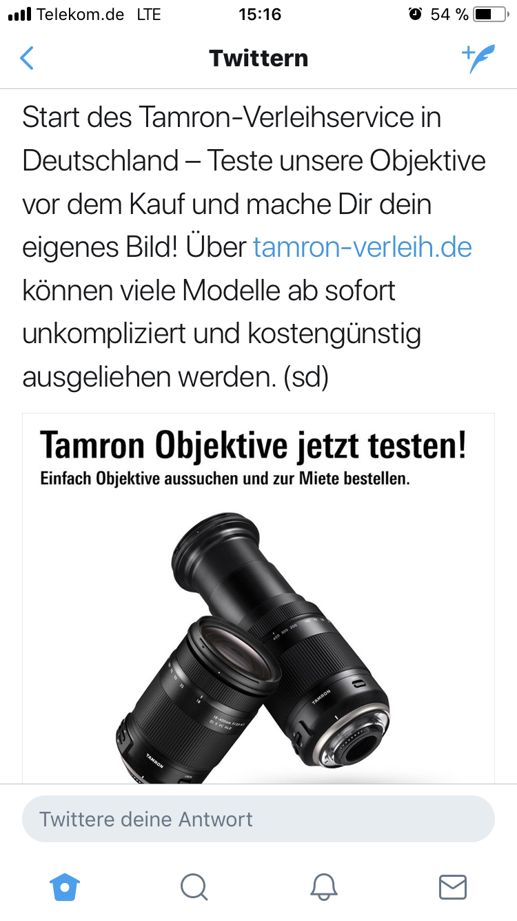 Heute bei Twitter gefunden: Bei Tamron Deutschland gibt es jetzt einen Objektiv-Test-Verleih. Dort kann man Objektive ausleihen/mieten um diese zu testen. Mietgebühr wird wohl teilweise auf den Kaufpreis angerechnet https://www.tamron-verleih.de/