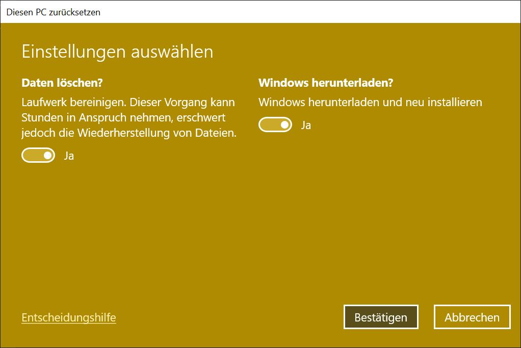 Den AiO habe ich mit Windows 10 Home angeboten. Dürfte so einfacher zu verkaufen sein, dachte ich mir. Zudem war das schon vorinstalliert, gehört also quasi mit dazu. Jetzt, wo der AiO halt verkauft ist, möchte ich den PC auf die "Werkseinstellung" zurücksetzen. Dies plane ich mit der unter Optionen > Update & Sicherheit > Wiederherstellung verfügbaren Option zu machen.