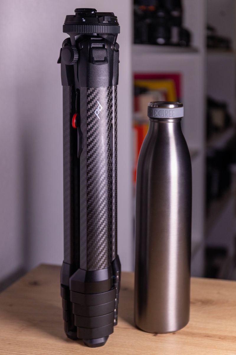 Ich bin eigentlich nicht so der Fan von Stativen, zumindest wenn ich es mit mir herumschleppen muss (sprich: draußen fotografiere). Für Langzeitbelichtungen sind sie aber ein notwendiges Übel. Mein altes Stativ war zusammengeklappt sehr sperrig und hat nahezu 3kg gewogen - da könnt ihr euch denken, wie gerne oder oft ich es draußen genutzt habe (nie :(). Den Travel Tripod von Peak Design kann ich dagegen auch mit gutem Gewissen mitnehmen, ohne ihn zu verwenden. Zusammengeklappt ist er kaum größer als eine Trinkflasche und wiegt mit 1,3 kg auch nicht viel mehr (zum Vergleich: die 750ml Trinkflasche auf dem Bild wiegt gefüllt etwas mehr als 1kg), lässt sich bei den meisten Rucksäcken auch einfach seitlich befestigen und stört nicht. Hat für mich ansonsten eine angenehme Höhe und lässt sich auch Bodennah einsetzen etc.