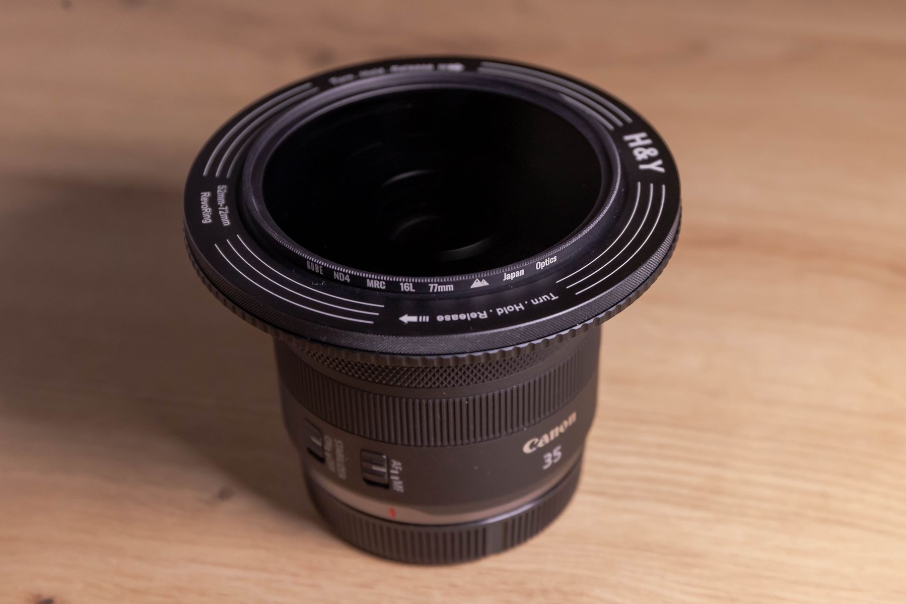 Mein Revoring fasst 77mm Filter und unterstützt auf der anderen Seite Filtergewinde zwischen 52 und 72mm. So kann ich zum Beispiel problemlos meine ND oder Polfilter an meinem RF 35mm f/1.8 (52mm Filterdurchmesser) nutzen, muss aber auch wenn ich mal andere Objektive mitnehme keine Adpter aus- oder einpacken (was man dann vergisst), bei mir hat stattdessen der Revoring einen festen Platz im Kamerarucksack.