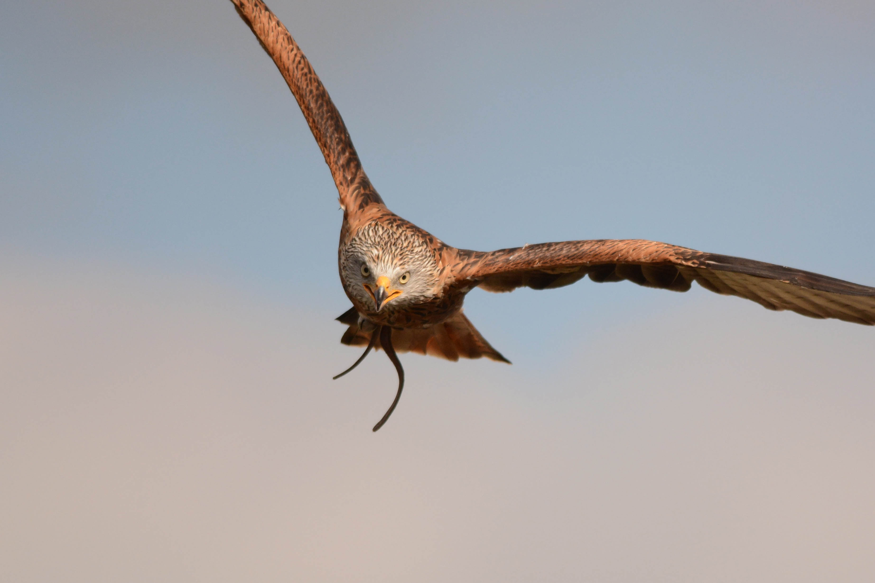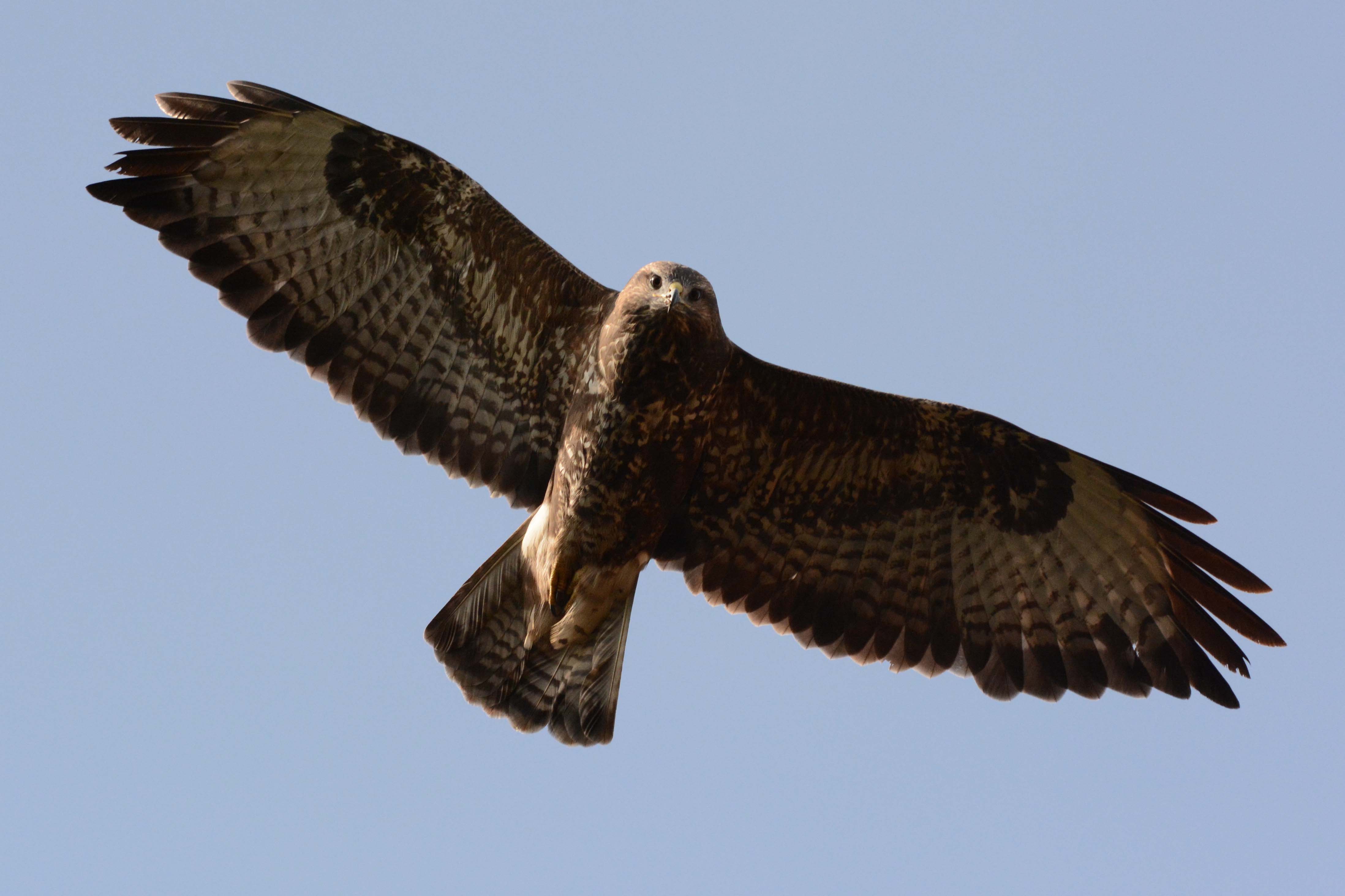 4. Ein Mäusebussard zieht ungefähr 15m über mir seine Kreise und schaut direkt in die Kamera. Bevor sich diese Gelegenheit bot, habe ich ca. 1,5 Stunden darauf gewartet, dass ein Vogel sich in Reichweite des 300mm Objektivs begibt. Dieses Bild ist nachträglich leicht zugeschnitten.
