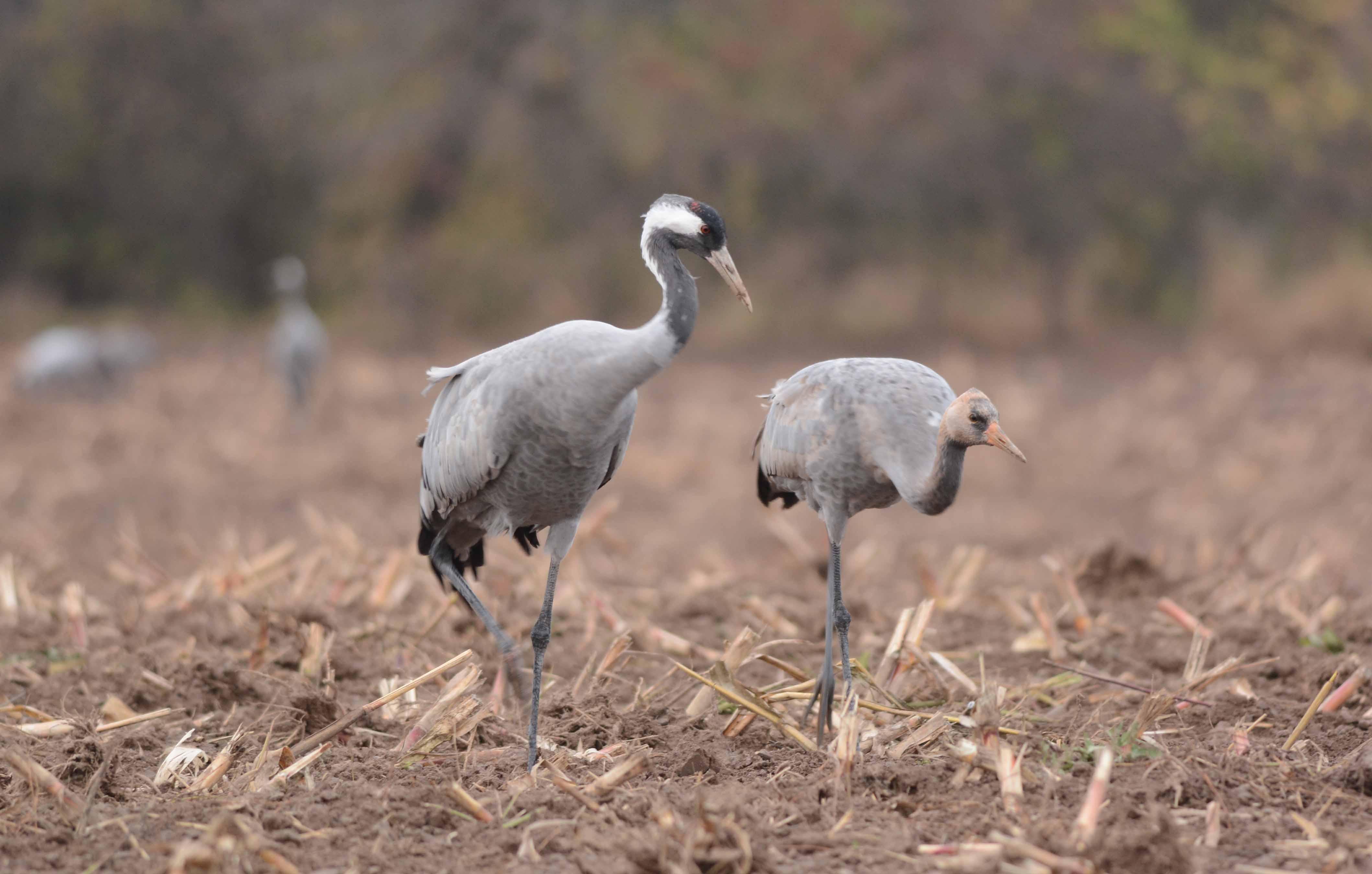 5. Im Herbst rasten an der vorpommerschen Ostseeküste bis zu 60.000 Kraniche. Dieses Bild zeigt einen Altvogel und ein Jungtier auf einem abgeerntetem Acker. Normalerweise haben diese Tiere Fluchtdistanzen von 200-400m, doch mit dem Auto kamen wir bis auf weniger als 20m heran, da sie gelernt haben, dass von Autos keine Gefahr ausgeht.