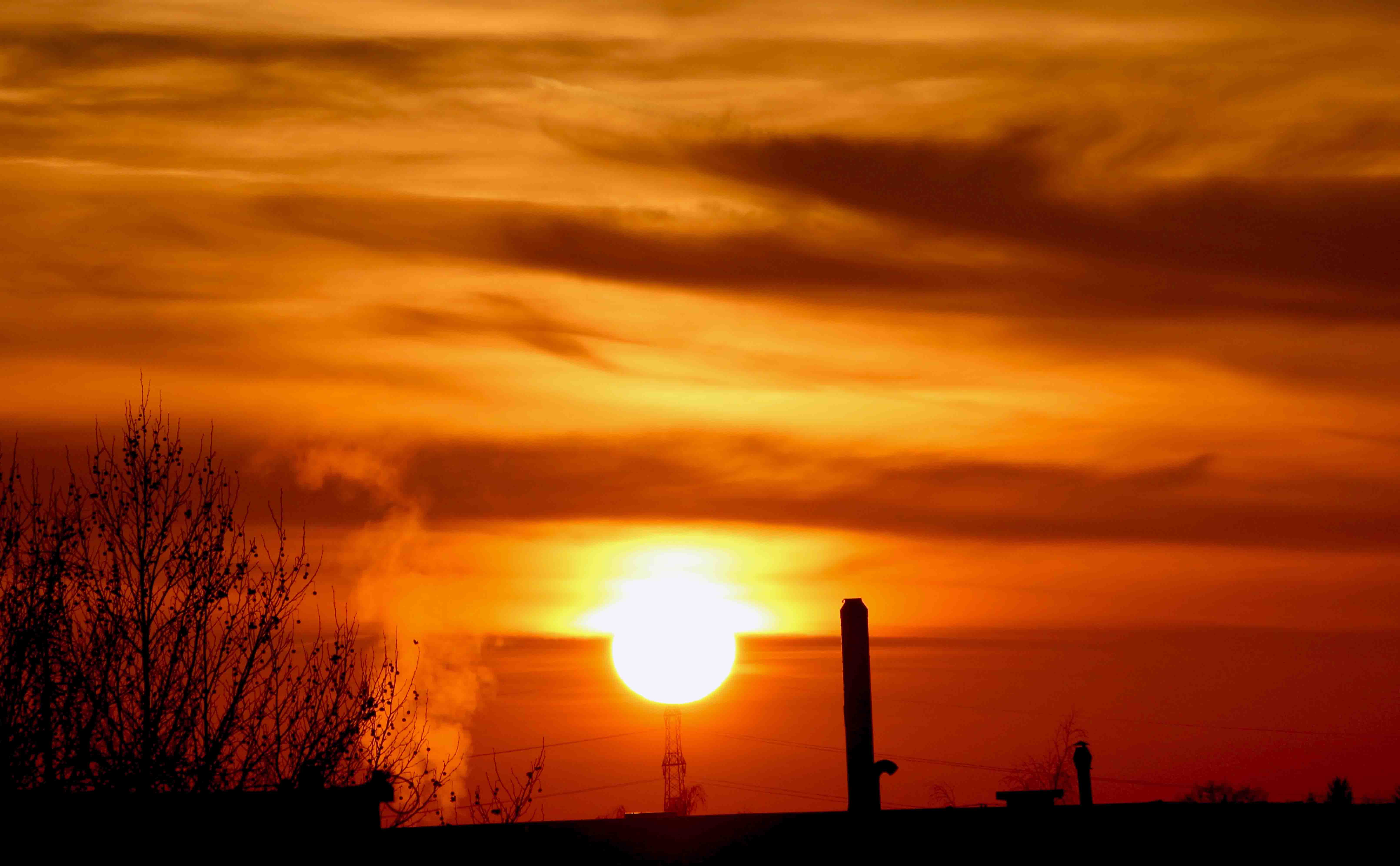 m.E. verbesserungswürdig ist die horizontale Ausrichtung, also insbesondere das Dach (?) unten sollte gerade sein. Der Baum links sowie die kleiner dargestellen Bäume rechts stören. Einerseits harmonieren sie untereinander nicht (z.B. wegen ihrer Größe), andererseits frage ich mich, ob sie zur Bildaussage passen. Seltsam wirkt auch, dass die Sonne auf den Strommast "aufgespießt" ist. Vielleicht wäre es noch besser gewesen, wenn die Sonne zwischen zwei Schornsteinen hindurchscheinen würde. Und der Strommast, auf dem die Sonne steht, sollte entweder komplett zentriert sein (wegen der herunterhängenden Kabel, die dann symmetrisch wirken würden) oder weiter hin zu einer Seite rücken (damit deutlich wird, dass Du gerade keine Symmetrie willst).