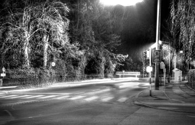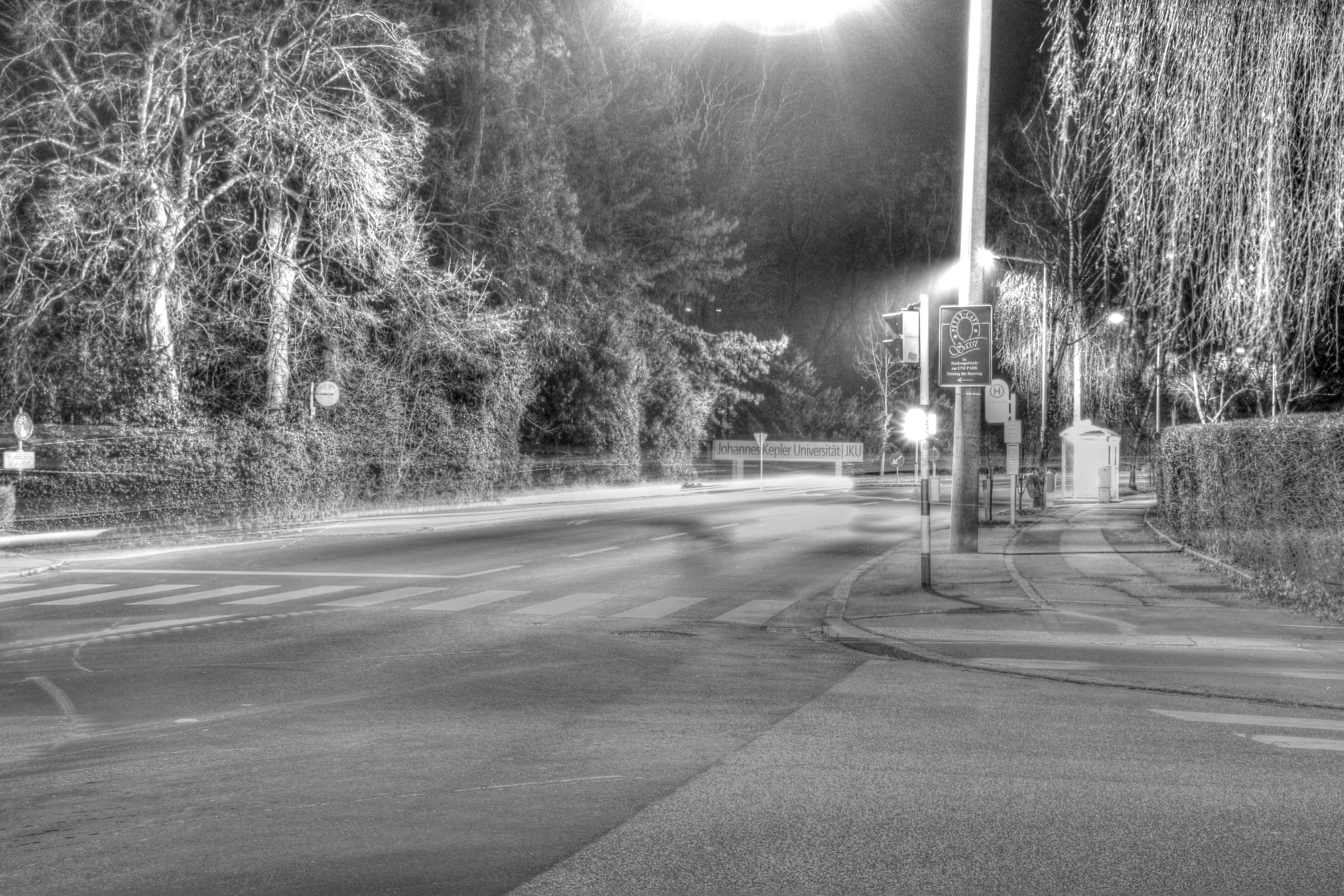 Ich habe mal ein paar Nachbearbeitungen vorgenommen - wie immer subjektiv und Geschmackssache. Im Wesentlichen: Vignette, Kontrast, Straßenlaternenmast abgedunkelt, leicht zugeschnitten. Wobei mir die Bäume links immernoch zu hell (weiß) sind.