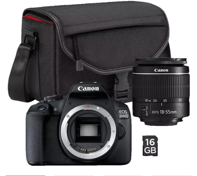 - Canon EOS 2000D (Gehäuse), EF-S 18-55mm, Augenmuschel Ef, Trageriemen EW-400D, Akku LP-E10, Akkuladegerät LC-E10E, Objektivdeckel E-58 II, Anleitung erste Schritte, Tasche SB130, SD Speicherkarte 16GB