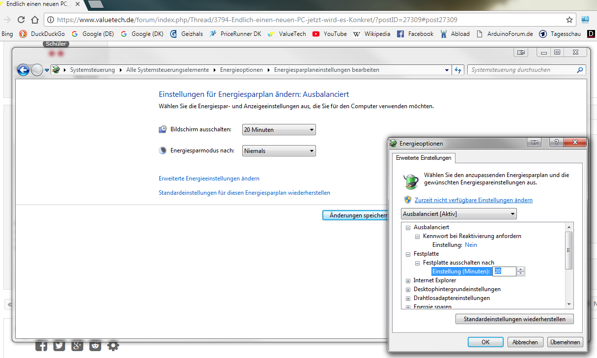 Ausschalten des Standby-Modus oder Zeiten, nach denen Platten "in den Schlaf fallen", ist unterhalb der Energie-Optionen zu finden.Genauer gesagt, findest Du die Möglichkeit dazu unter den erweiterten Einstellungen.